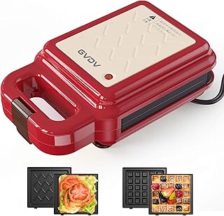 GVDV ホットサンドメーカー 電気 耳まで焼ける ワッフルメーカー 着脱式 両面焼き 4枚プレート レシピ付き 家庭主婦/一人暮らしに 結婚/出産/引越し祝いにも人気 可愛い レッド